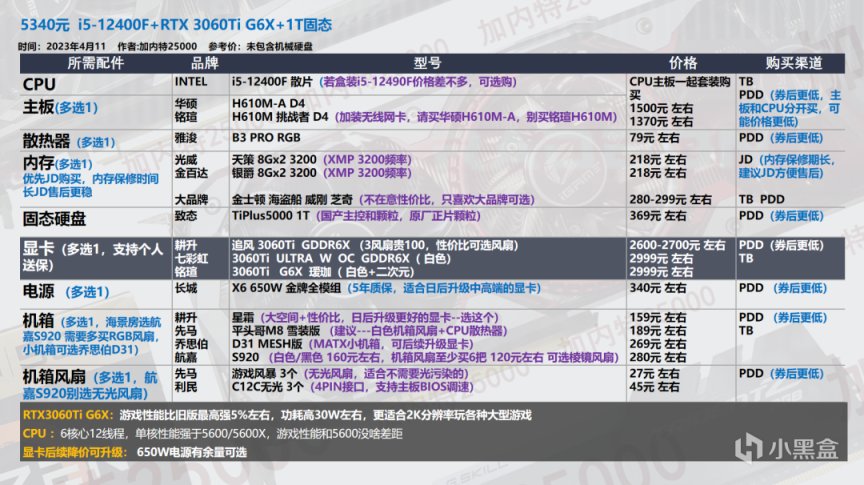 相比前两套,i5-12400F性价比较一般,主板华硕H610M-A灯光同步效果更好一点,更方便加装无线网卡。铭瑄H610,对内存的兼容性不是很好,建议京东购买内存,遇到问题,方便退换货。