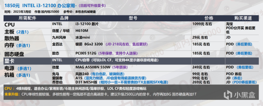 第2套CPU i3-12100,满足家用/办公的大部分场景,550W电源,留足了未来升级显卡的空间。