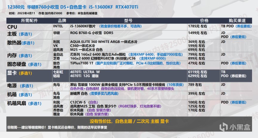 有高颜值要求,白色主题装机,主板华硕B760小吹雪安排,喜欢二次元也可以选铭瑄的二次元显卡。这套的缺点是毫无性价比。
