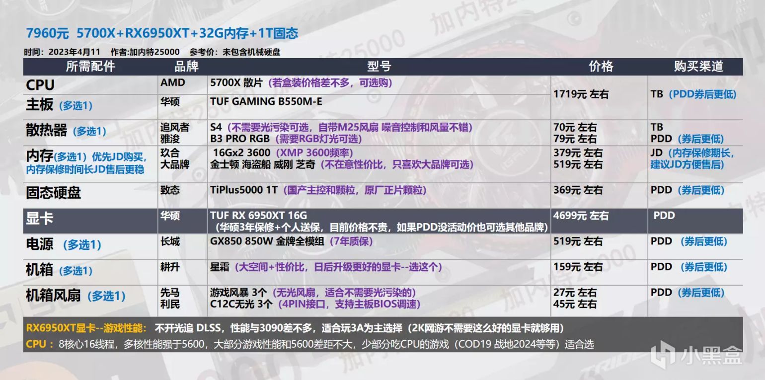 新增加显卡RX6950XT配置方案,如果你刚需高性能显卡,装机预算七八千,AMD 6950XT 16G,不开RTX和DLSS,游戏性能有3090的水平,显存管够,不用担心大型游戏最高画质显存不够用。