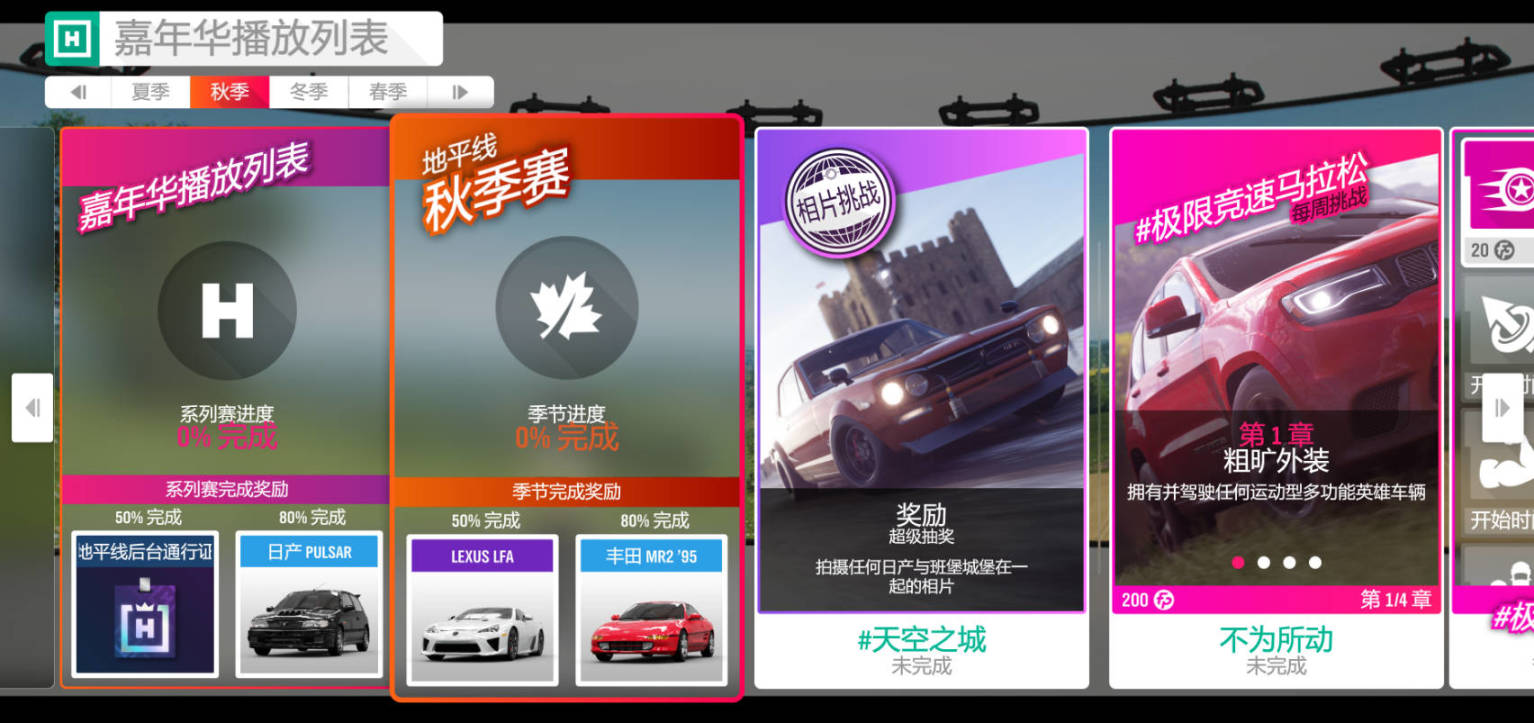 秋季賽進度獎勵爲50%完成2010款LEXUS LFA和80%完成1995款豐田 MR2 GT