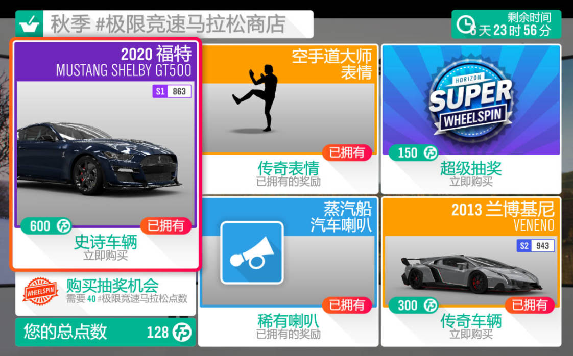 本週更新車輛爲2020款福特 MUSTANG SHELBY GT500和2013款蘭博基尼 VENENO。GT500是稀有車,沒有的推薦兌換;毒藥車展車100w吧
