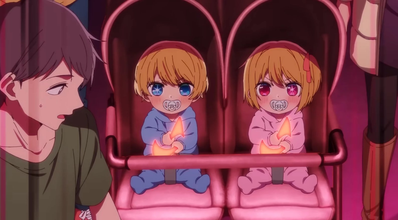 母亲星野爱在舞台演出,两个孩子坐在摇篮里面挥舞应援棒的场景。