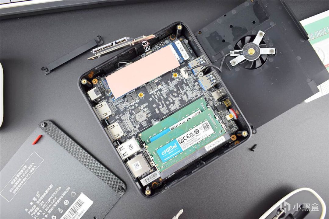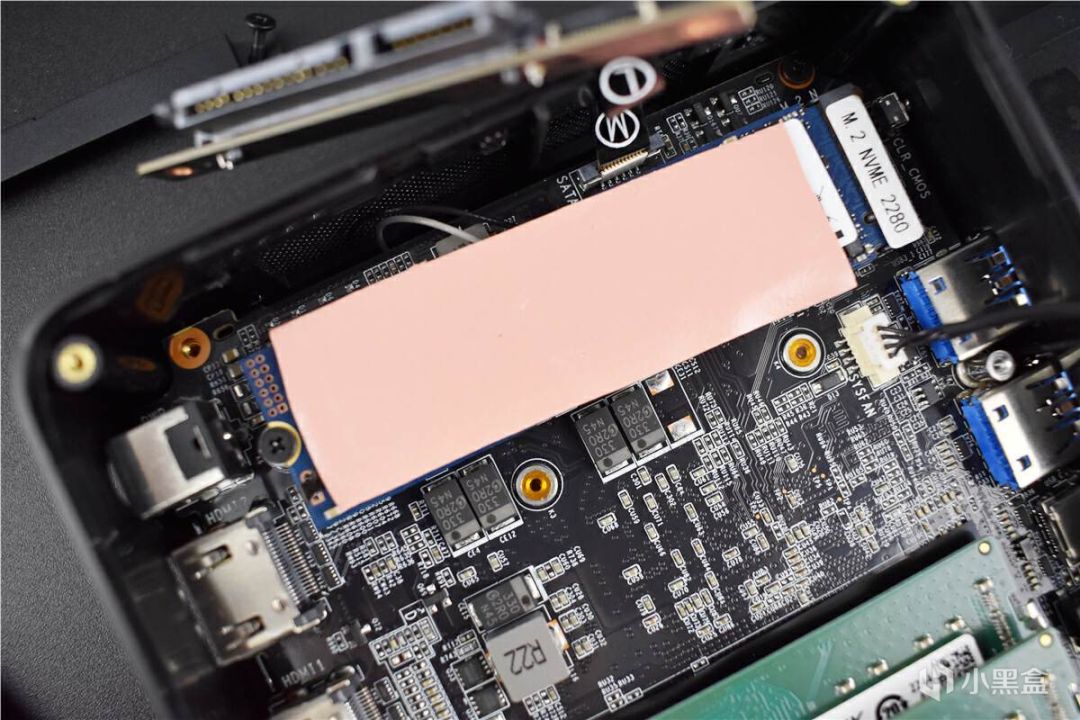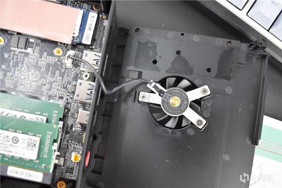 当然,如果不喜欢SATA硬盘,大家也可以继续拆机,取出系统风扇支架,就可以看到零刻自带的500G M.2 2280 NVMe SSD硬盘了,大面积的散热胶可以确保硬盘持续稳定地工作;手里若是有更大硬盘,可以直接替换,但是需要用户重新装系统,相信大部分朋友是能够独立完成的。