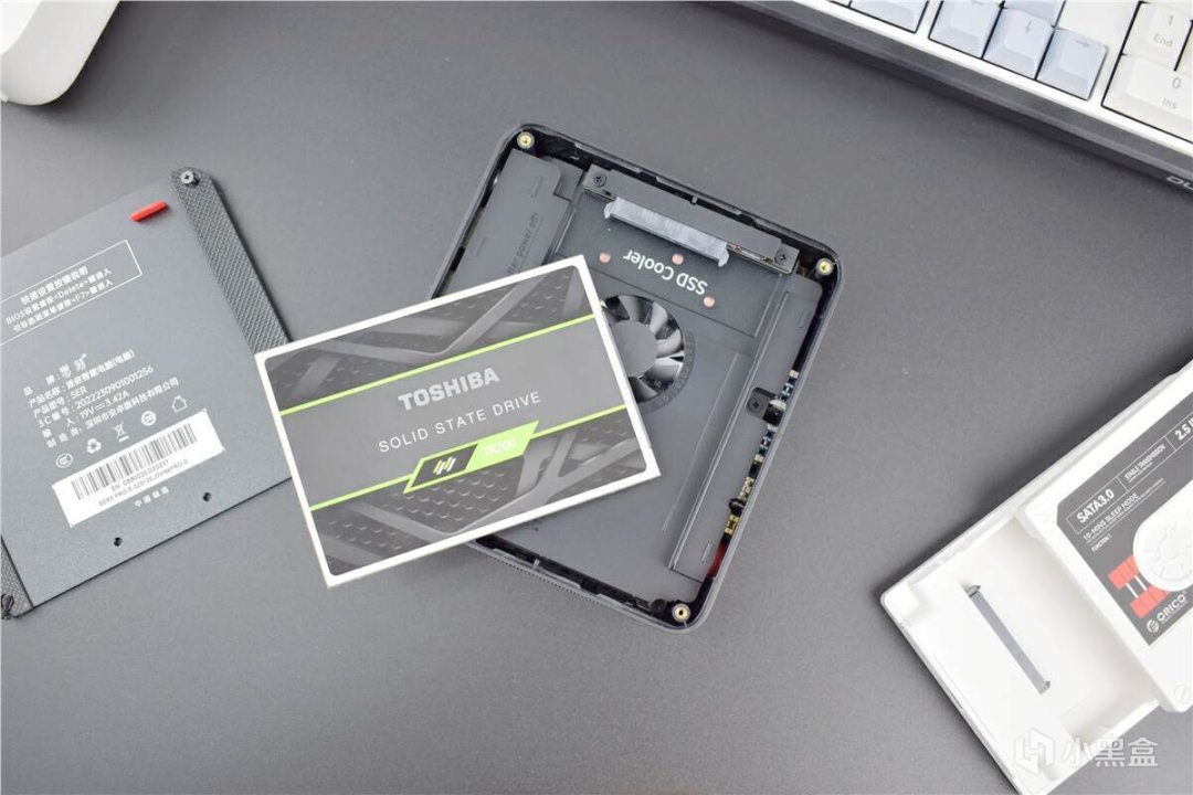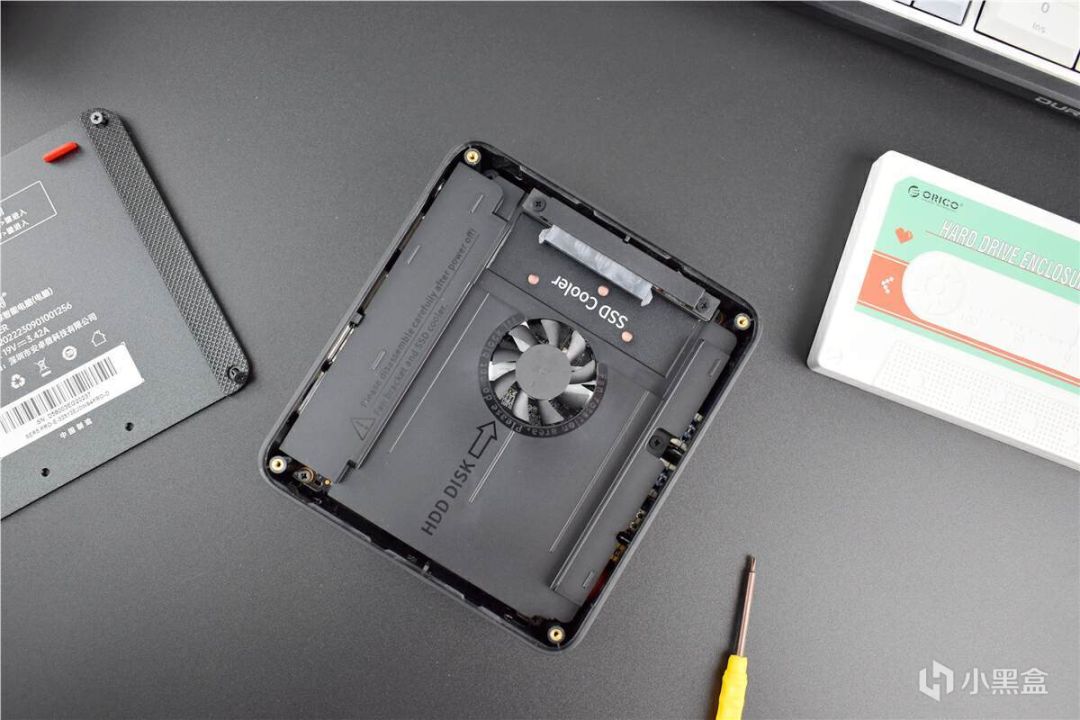 如果用户入手的是准系统版本(无硬盘和内存条),或者想要自己给SER5 Pro 5800H升个级,换个大容量硬盘,可以直接从主机底部打开。官方设计师更是贴心地为用户准备了开盖的橡胶抓手,打开底盖首先看到的就是预留的2.5in HDD硬盘位,用户可以直接加一块SATA硬盘,组成双硬盘方案。