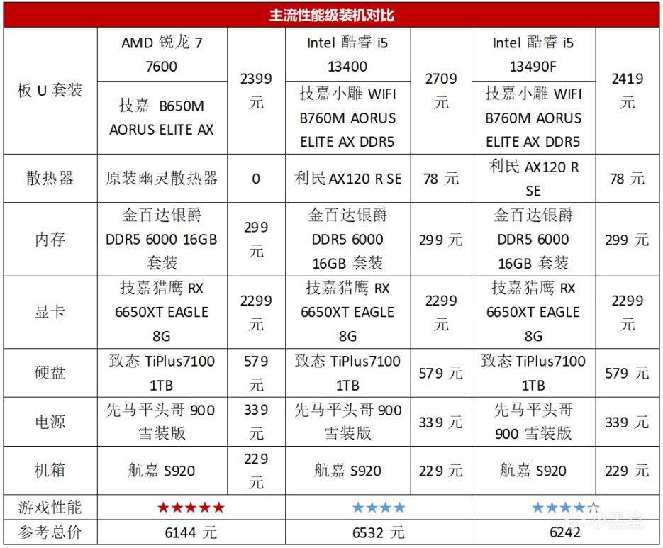 可能會有用戶擔心銳龍5 7600主機打造成本高,其實並不是這樣。現在電商平臺上有一些板U套裝已經比較實惠了,比如這款AMD銳龍7 7600+技嘉 B650M AORUS ELITE AX的套裝價也不過2399元,是要低於兩款酷睿i5的套裝。而且得益於銳龍5 7600功耗更低的優勢,使用自帶的原裝幽靈散熱器即可滿足散熱的需求,不用額外購買散熱器增加裝機預算。僅憑這一點,在其他硬件相同的前提下,就讓銳龍5 7600的裝機成本低於兩款酷睿i5。