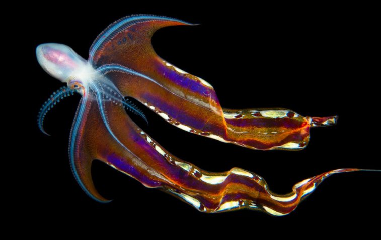 这种章鱼有一种奇怪的捕食方法:使用从有毒水母身上撕下的触手作为武器。