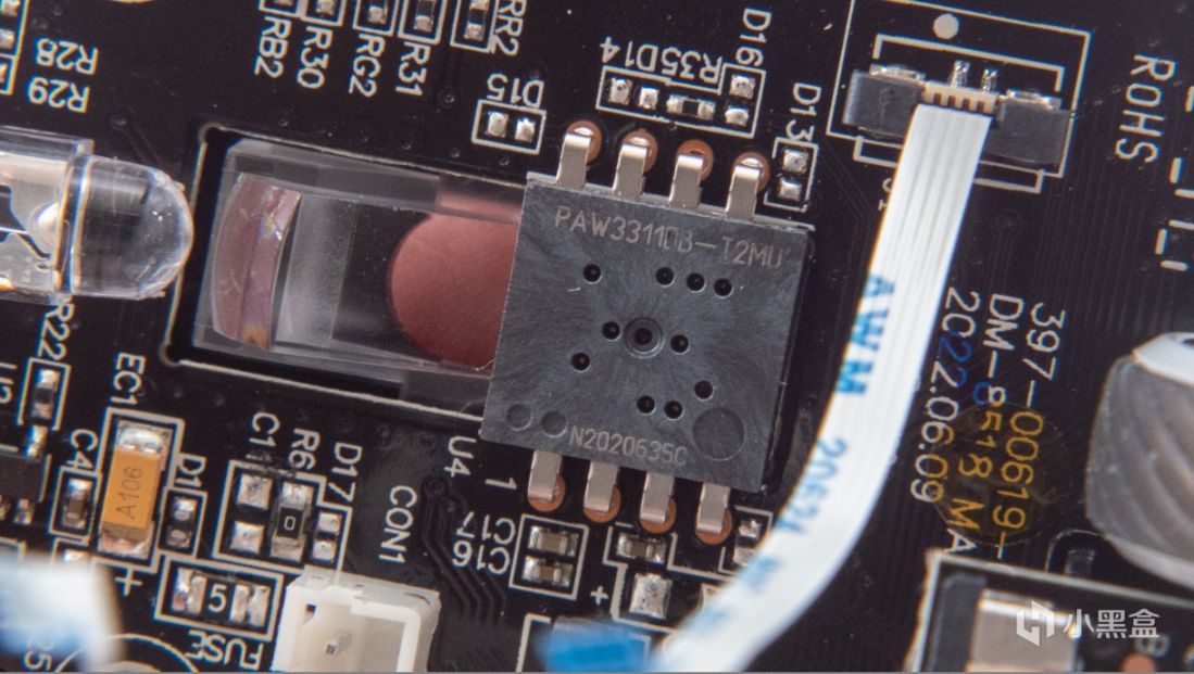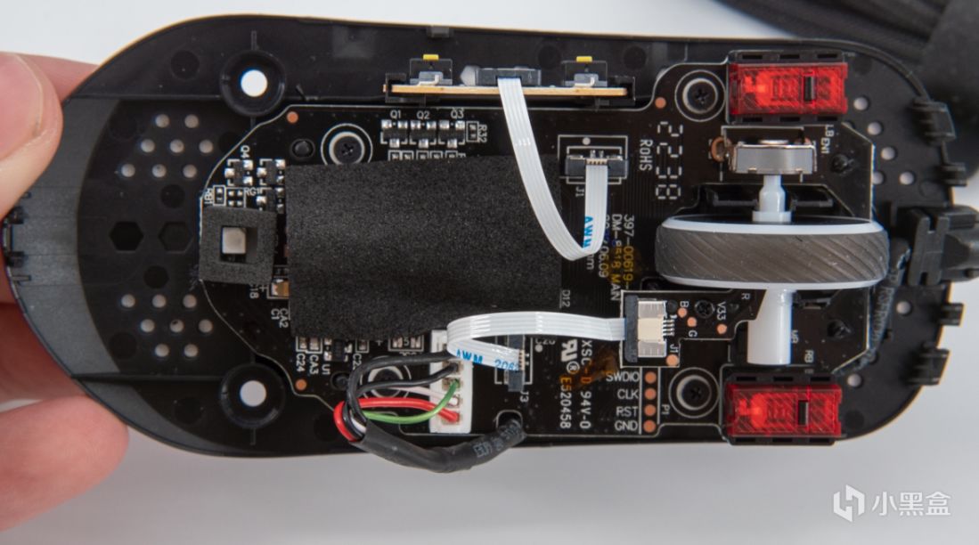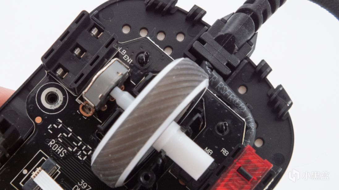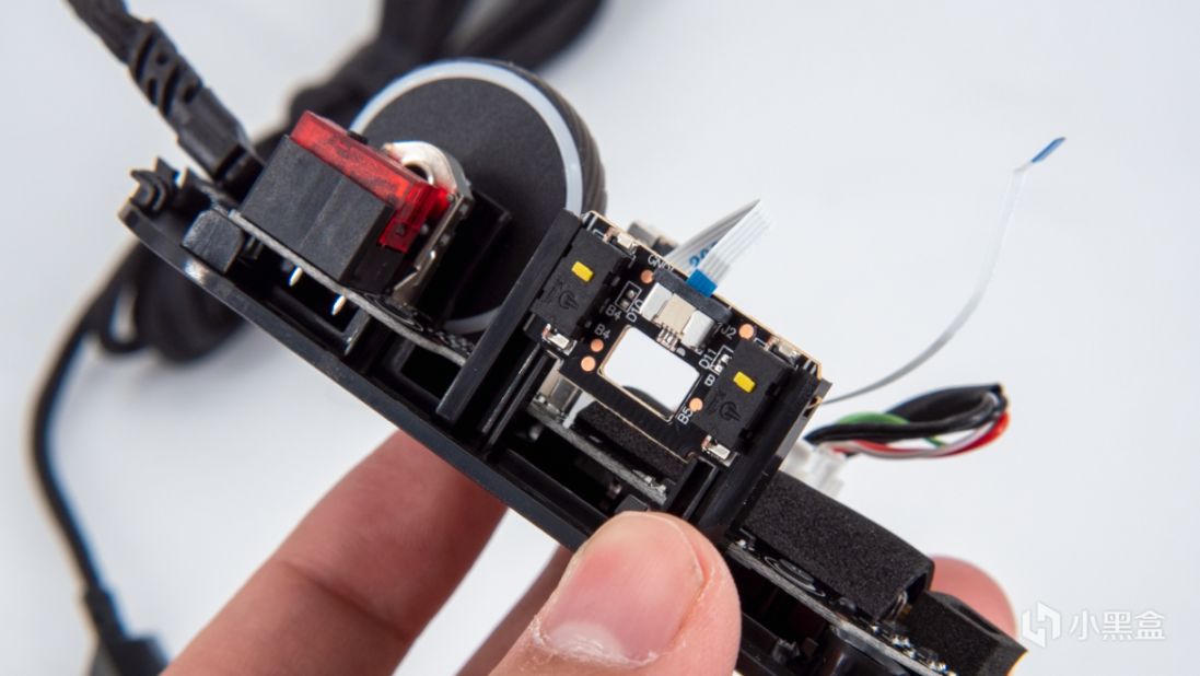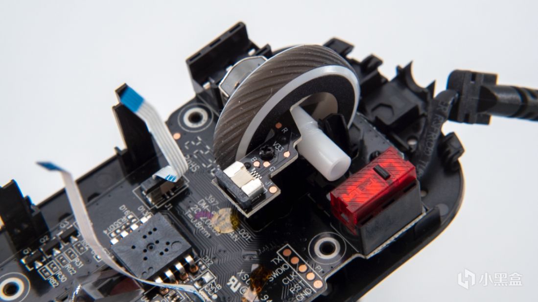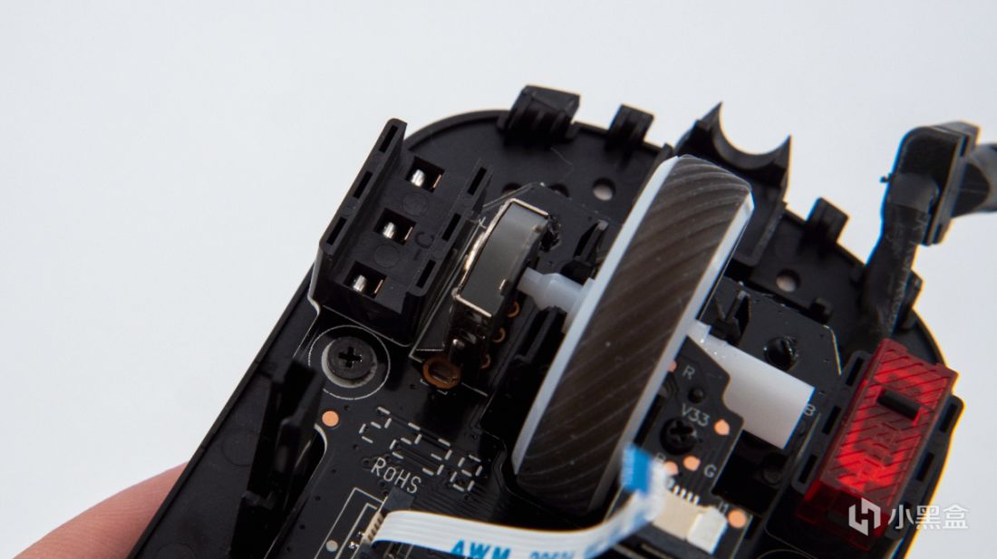滚轮为了减重做了挖空设计,内部灯光由固定在小板上的两科RGB灯珠控制,通过排线连接到主板上。