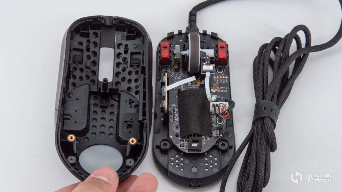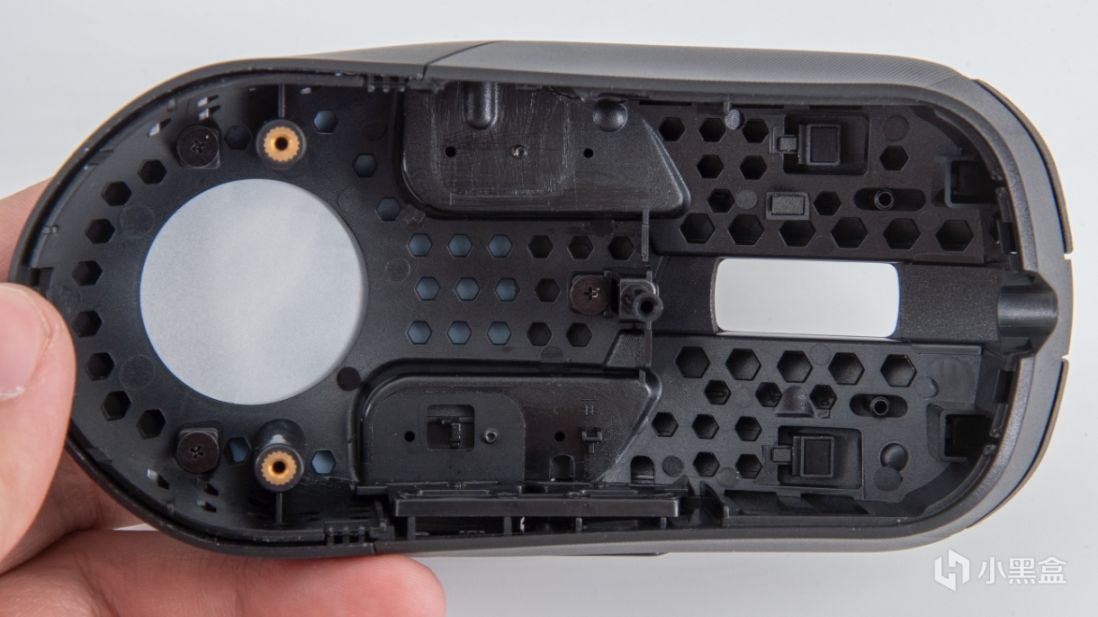 最后来看拆解,影刃3因为支持热插拔微动所以拆解也非常简单,撕掉底部的两张贴纸拧开两个大螺丝就能把鼠标无损打开。