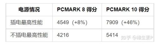 PCMARK10 插电情况下得分为 7909 , 不插电情况下同样模式得分为 5414 .