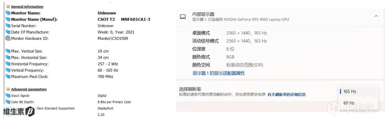 屏幕分辨率是 2560*1440,16:9 比例,165Hz的高刷屏。刷新率可以自己设置为165Hz 或者 60Hz