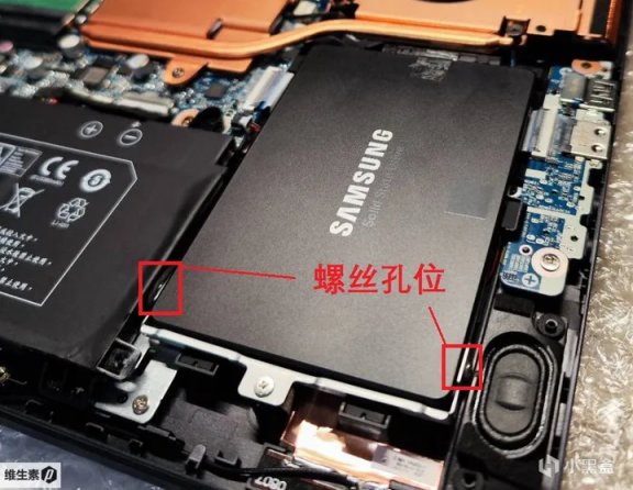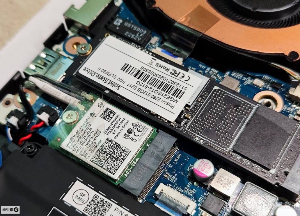 有点可惜的是自带的硬盘也比较一般,而且机身内部没有双M2,而是 M2 + SATA 的硬盘接口。这个 SATA 硬盘接口里面有透明的强黏性胶带,可以用于辅助固定,支架槽的接口有螺丝孔,包装内应该会有附赠两颗小螺丝。