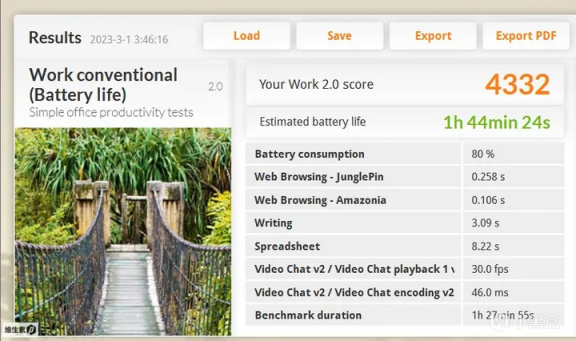 用PCMARK 8测出来的续航,数据会更接近真实的办公使用场景。