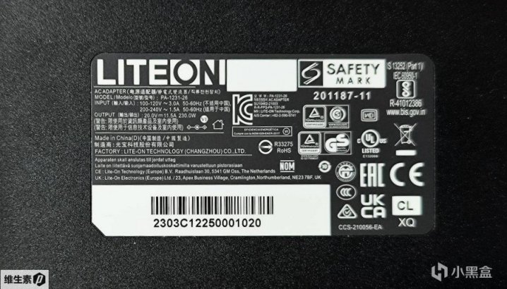 圆孔电源适配器来自光宝科技,20V-11.5A,总共 230W 输出。