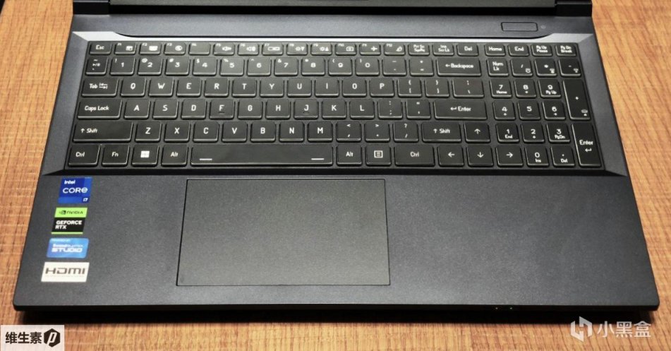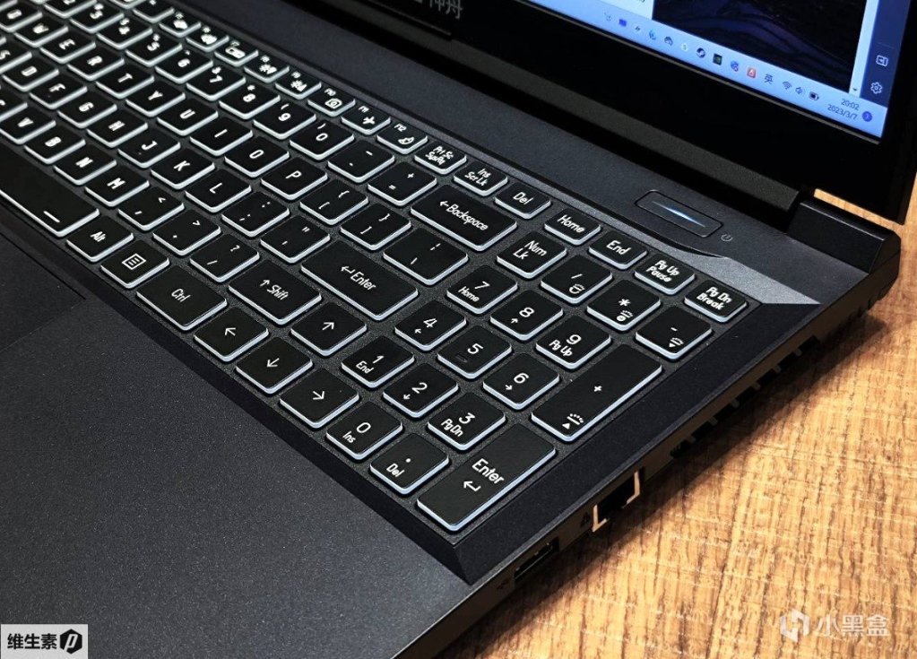 键盘带有小数字区域,方向键为全高设计,并且占用了一部分的数字区,右上角是独立的电源开关。
