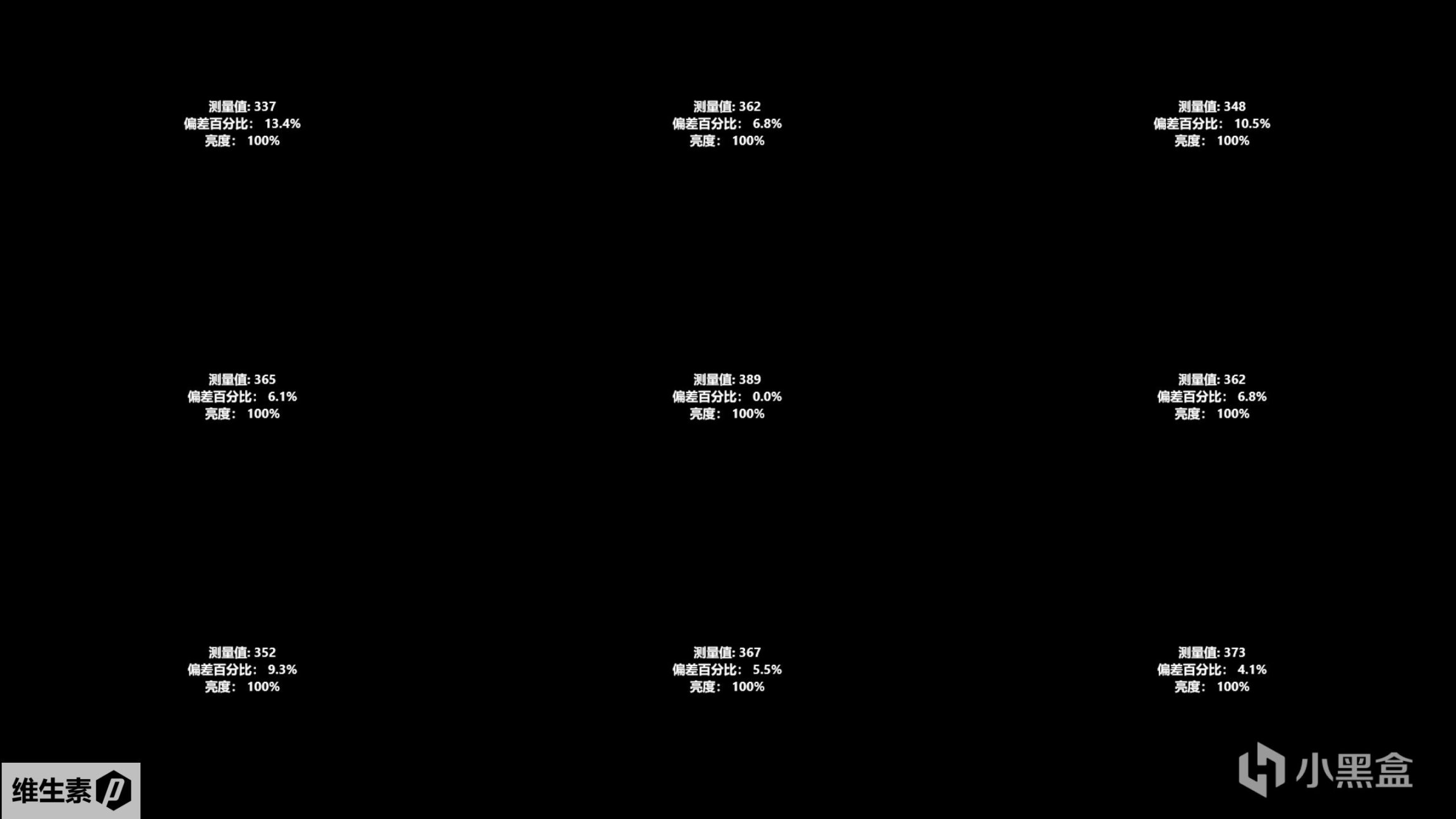 100%亮度下中心亮度最高 389nit,最低亮度右上角 348 nit。