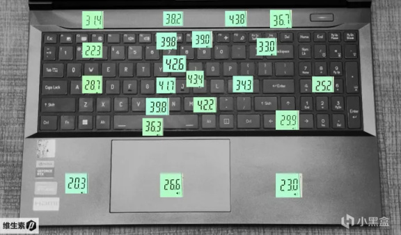 主要的高温区域集中在键盘位YU案件位置,以及靠近转轴的中右区域.