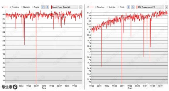 独显的单烤结果如下图,功耗基本在 140W 上下,有一点波动,温度不是很高,在85度之下。