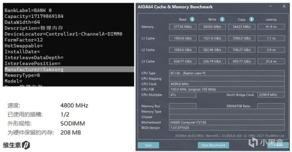 内存来自三星,单通道 DDR5-4800MHz 的 16G 内存。