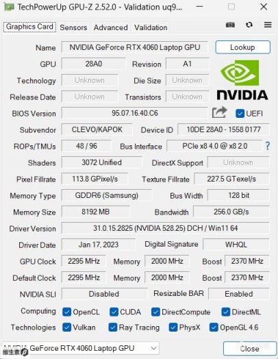 显卡是 RTX 4060,用上了新的 AD107 核心(台积电4nm),Ada Lovelace 架构 GPU,核心面积大幅缩小。着色器数量 3072,显存 8G GDDR6,128 bit 位宽。
