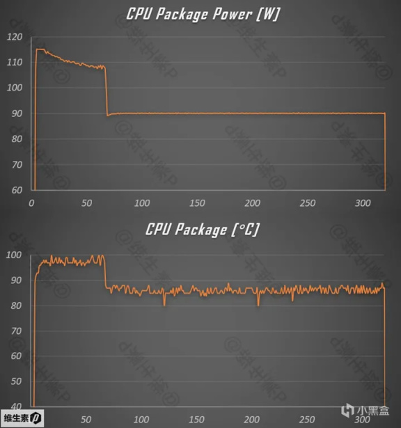 单烤的功耗,一开始就直接升到了115W,然后逐步下滑到108W, 再突降后,维持在90W的状态。