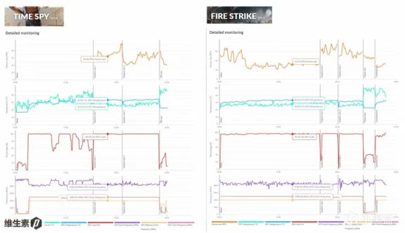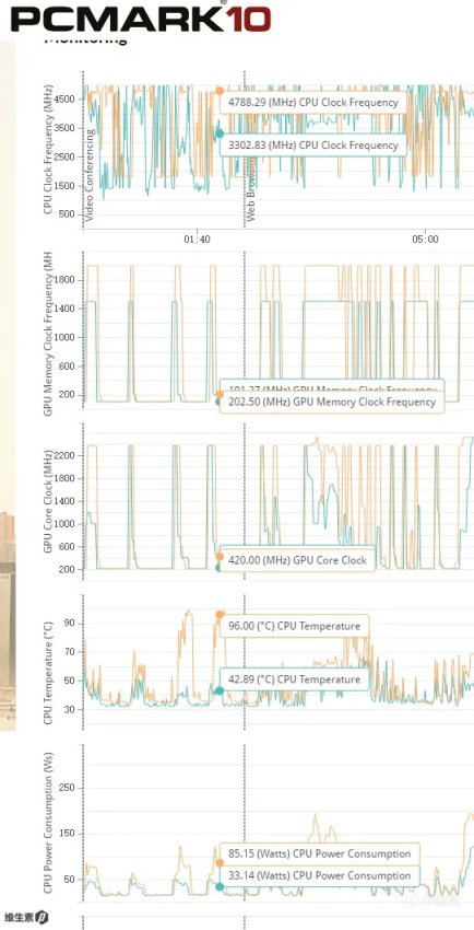 这个离电性能的差距,主要是在功耗释放上。从细节数据可以看到,插电高负载的时候,CPU温度和功耗都非常激进,但是不插电的时候,功耗释放就弱了很多,CPU的频率也有较大差距。