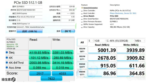 硬盘来自 群联 Phison,PCIe 4.0 的 NVMe 固态硬盘,相关测试如下所示。