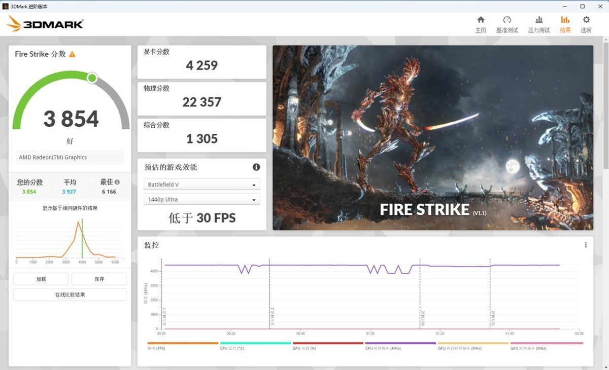 3DMark基准测试,Fire Strike 3854分,其中显卡分数4259分,物理分数22357分