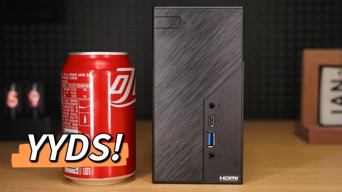 首先说说它的外观设计,这款主机采用了简约的四方体造型,配色为全黑色,前面板上有不规则的造型,非常耐看。而且,它的尺寸非常小巧,仅有155x155x80mm,体积仅有1.92升,这是什么概念呢?大家看看旁边的可乐就知道这个主机确实是非常的小巧,可以随意放置在家里的各个场景中,非常便携。