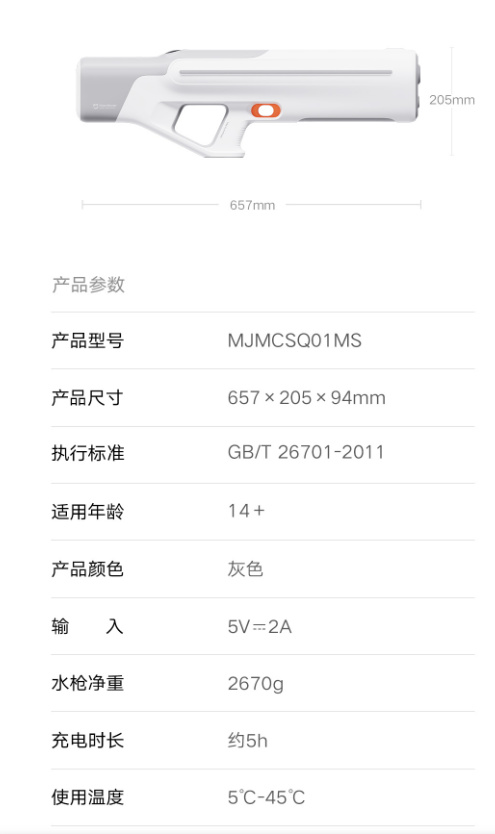 据产品页介绍,小米米家脉冲水枪适用于14 岁及以上人群使用,配有炫酷动态灯效,可随着射击节奏同步闪烁,长度达 657mm,重量 2670g。