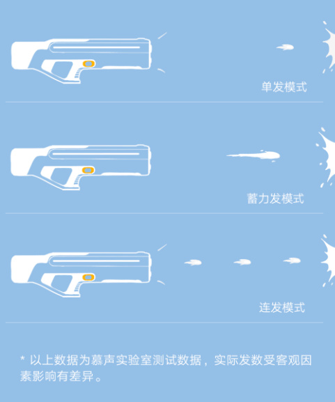 该水枪支持 10-15 秒自动吸水,可选连发、单发、蓄力发三种发射模式,最多拥有 25 发水弹,射程可达 7-9 米。