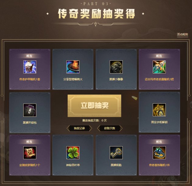 每日完成签到,在获得累积皮肤奖励的同时,千万别忘了来周年庆页面抽奖,奔着大奖往前冲,就算这一次没抽到,也一定要相信你的每一次保底奖励都是为下一次大奖做准备,说不定下一次幸运儿就是你呢!更何况,本次保底奖励也是很不错的哟!