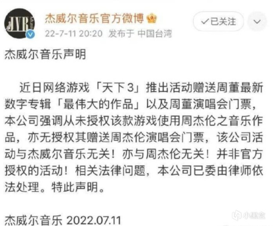 《天下3》官方于2022年7月12日再次发微博并@杰威尔公司,表达了对歌手的喜爱,并回应: