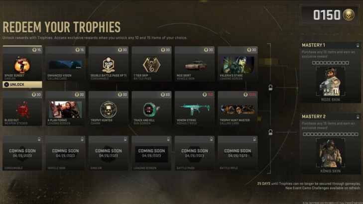 在《战区2》中,真人和电脑敌人都会掉落代币,但是如果玩家死亡则会失去所有代币。因此玩家必须要赢得大逃杀,或在购买站将代币存起来才能获取代币。在“DMZ”玩法和《战区2》的代币获取方法相同,并且同样会在玩家死亡时全部丢失。可兑换的奖励包括名片、武器皮肤和挂件、赛季通行证经验值加成等。解锁 10 个和 15 个物品后,还将获得两个角色皮肤。一批新的奖励将于 4 月 26 日开放供玩家兑换,包括一个新的战斗步枪武器蓝图。所有可解锁奖励如下图所示: