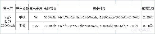 然而实际过程中由于存在能量损失,输出能量往往达不到14800mAh、6200mAh,于是便引入了额定容量这一概念。额定容量是厂家出厂前测试的实际输出能量最低值,以铭牌所标额定容量12000mAh 5V 4A计算,至少能为我手机充满2.4次(12000mAh÷5000mAh=2.4),为我平板充满0.71次(12000mAh×5v÷12v=5000mAh,5000mAh÷7000mAh=0.71)。