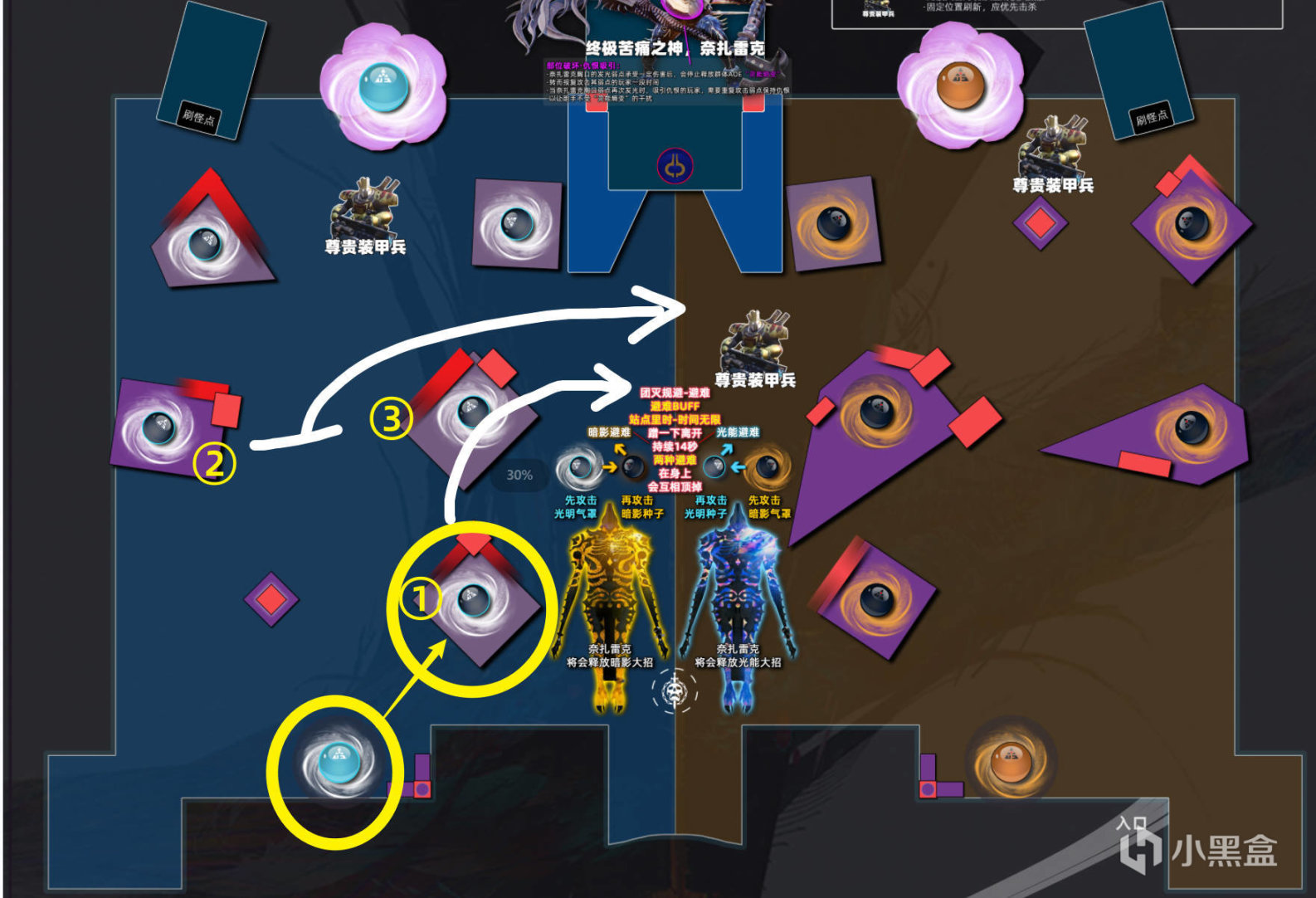 普遍打法:左邊 3人連完前3朵花,右邊 3人 連完 前朵花後,左右半場人員對調場地連完剩餘的花朵(如果時間不夠,在對調後由第1個連線的人制造1次避難所)(最後一個花記得同時打)(沒事幹的人清怪或者拉BOSS)