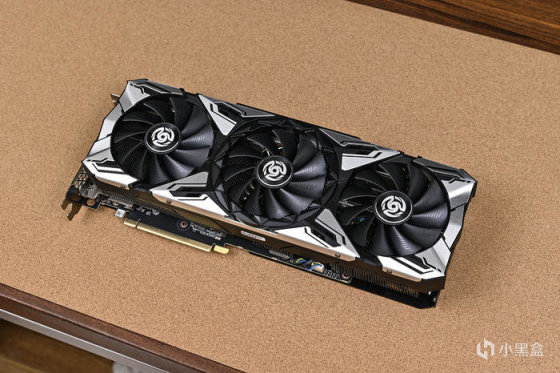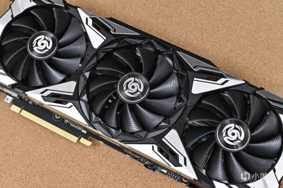顯卡正面展示。索泰 GeForce RTX 4070 Ti 天啓 OC 正面延續了 30 系天啓的設計元素,採用三風扇設計,顯卡導流罩佈滿了各種幾何紋路和棱角,黑色主色調搭配銀鱗合金甲片,增加顯卡結構強度的同時讓顯卡外觀更加有質感。這款顯卡採用了全新升級的高效冰靜散熱系統,搭載盾鱗 2.0 仿生扇葉、鏡面拋光散熱底座、6 根冰脈 2.0 熱管、全覆蓋高密度鍍鎳鰭片,對流穿透散熱設計,能大大提高顯卡散熱效能,釋放核心全部潛能。顯卡整體尺寸爲:334x131x64mm,2.5 槽設計,基於 GeForce RTX 4090 圖形核心設計,配備 S.E.P2.0 供電系統,12+2 相高規格供電,擁有流處理器 7680 個,顯存 12GB GDDR6X,顯存位寬 192-bit,核心頻率 Boost: 2670MHz,顯存頻率 21Gbps,功耗 285W。