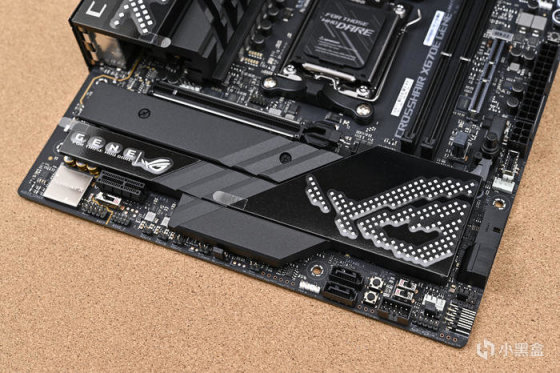 芯片組散熱片表面的立體像素點陣風 ROG 敗家之眼。提供 4 個 SATA 接口,其中左側兩個垂直主板,另外兩個平行主板,旁邊緊挨一組前置USB 3.2 Gen1 19-pin接口。