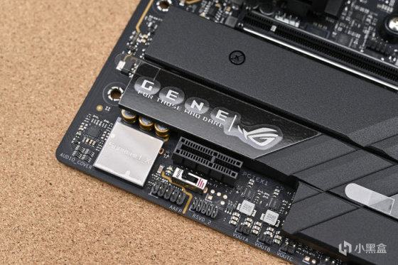 ROG CROSSHAIR X670E-GENE 散熱模塊斜切鏤空,內置 RGB燈,支持神光同步。主板供電散熱模塊採用一體式設計,頂部覆蓋印有 ROG CROSSHAIR 字樣 Logo,點陣風格。