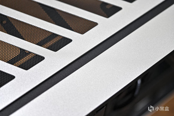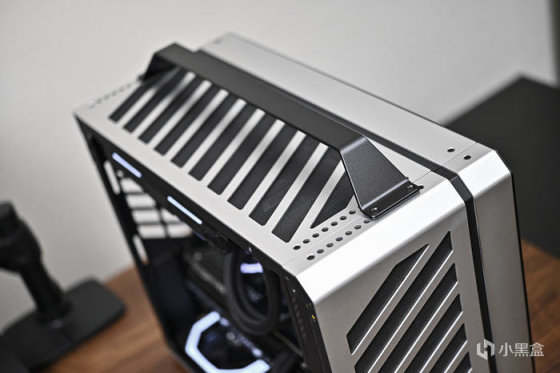 機箱頂部和前面板同樣的 AIR 斜紋開孔通風設計,預貼黑色防塵網。頂部安裝了金屬提手,方便移動。