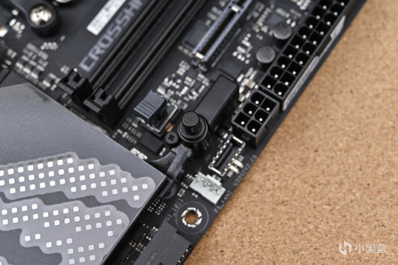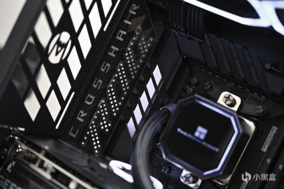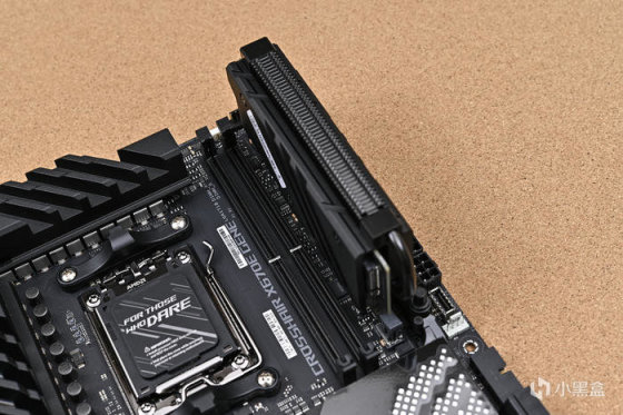 CPU 供電散熱模塊採用一體式設計,頂部覆蓋印有 ROG CROSSHAIR 字樣 Logo,點陣風格。