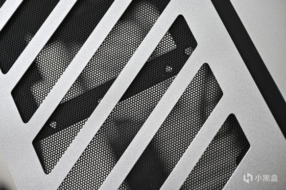 I/O 側的散熱模塊斜切鏤空,內置 RGB燈,支持神光同步,在不通電時呈現鏡面效果。