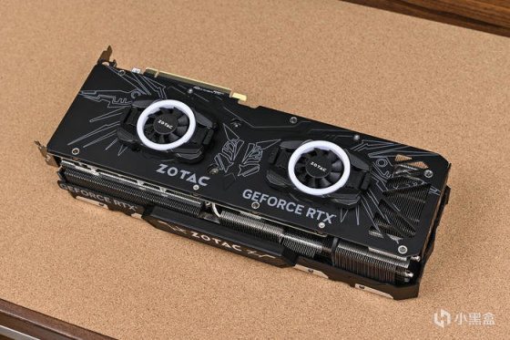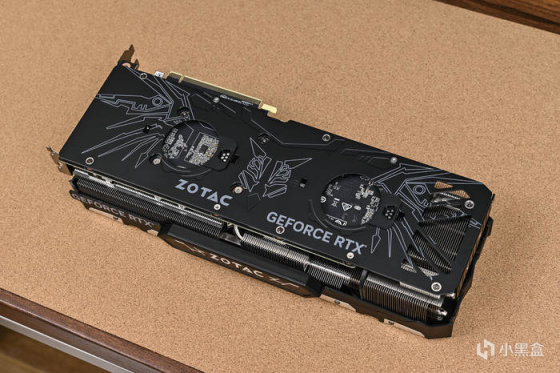 顯卡背面標配金屬背板,採用高強度合金材料一體鑄形而成,增加顯卡結構強度,有效保護PCB,提升顯卡靜電防護能力,同時背板尾部做了大面積開孔,方便正面風扇將鰭片熱量從此處快速排出,提高散熱效率。背板上的雙翼元素源自於天啓姬的鈞天裝甲,在背板設計了兩個卡槽,可以插入包裝內隨附的兩個 RGB 小風扇爲顯卡輔助散熱,下方還印有 ZOTAC 和 GEFORCE RTX 字樣。