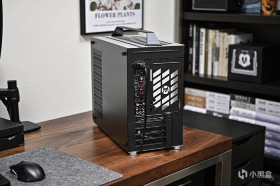 機箱背部一整塊黑色鋼板,左側條紋通風開孔。