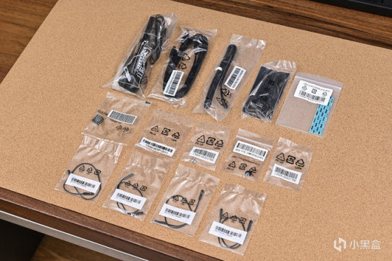 零散附件包括:1 條無線網卡天線、2 條 SATA6 數據線、1 條ARGB連接線,1 個金屬簡易顯卡支撐架(底部爲磁吸設計),1 張 M.2 導熱貼以及與其他附件和板載接口所對應的連接線、測溫線、M.2螺絲包和安裝扣等若干。