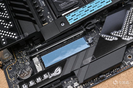 拆開主板 PCIE 插槽下方的 M.2 散熱片,預裝了底部散熱片,初始位置適配 2280 尺寸,對於 2242 與 2260 背面散熱片上預裝的導熱墊已經預留開孔線,只需去除並在下方散熱片擰上對應尺寸的固定扣即可。