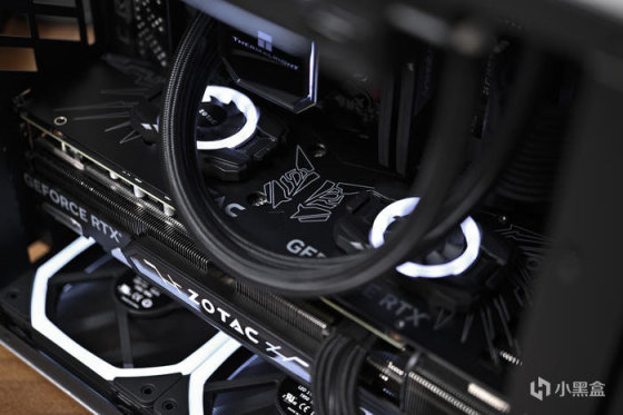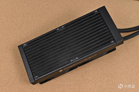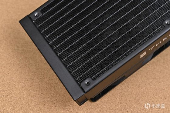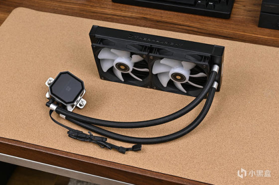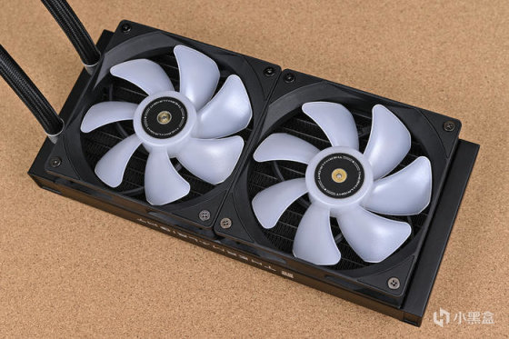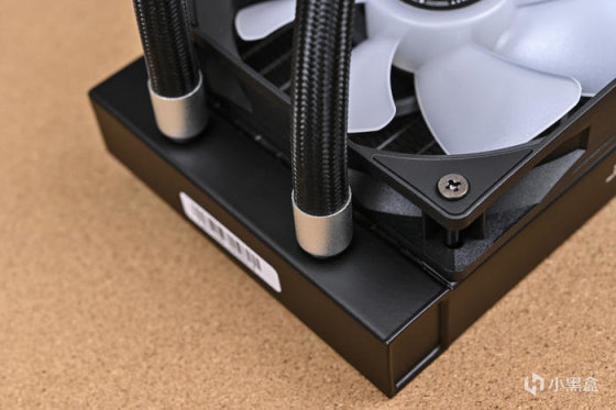 取出水冷本體。水冷通體黑色,水冷管接口採用鋁合金材質,低調但又不失質感。水冷管經過特殊設計,爲 6.5mm 內徑官腔,高分子聚合物編制防護,高耐磨、低蒸發、長壽命。水冷出廠兩顆風扇預裝冷排至之上,可以省去安裝風扇的繁瑣,提升安裝體驗。