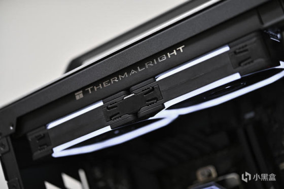 冷排安裝的兩顆機械大師 KKock KL120 RGB 卡卡洛克風扇燈效。冷排上印有有亮銀色利民 Thermalright 金屬 Logo。