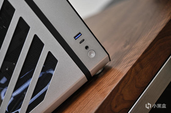 機箱I/O 在前面板右下角,從上到下分別爲:1xUSB3.0 TypeA,1x10G Type-C,1x3.5mm音頻複合接口、1x 機箱開關內置白色LED指示燈。