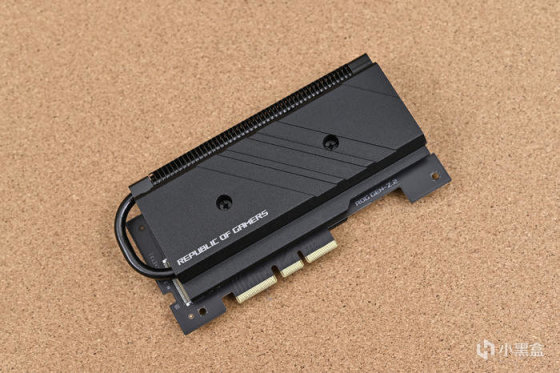 附贈的 GEN-Z.2 的 M.2 插卡式擴展卡,正反面都覆蓋了大面積散熱片,頂部延伸出一條熱管,採用了定製接口與主板連接,且不會影響 PCIe 5.0 x16 插槽的速率。